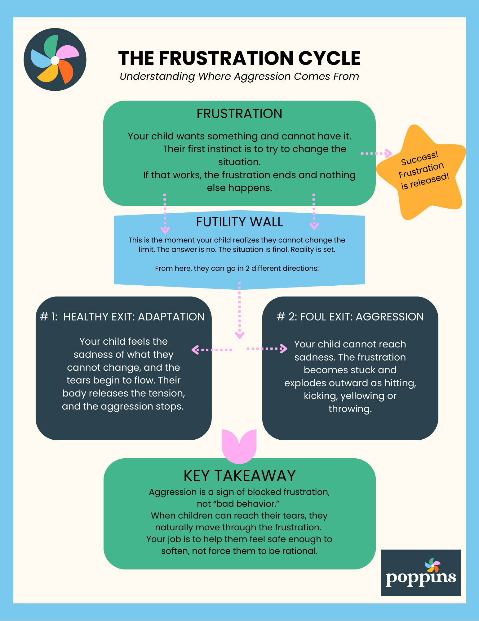 The image shows what happens in your child’s brain when something isn’t working: They first try to change the situation. If they can’t, they hit a wall of futility. If they can access tears → they adapt. If they can’t → aggression erupts. Aggression is frustration that couldn’t find its way to sadness.