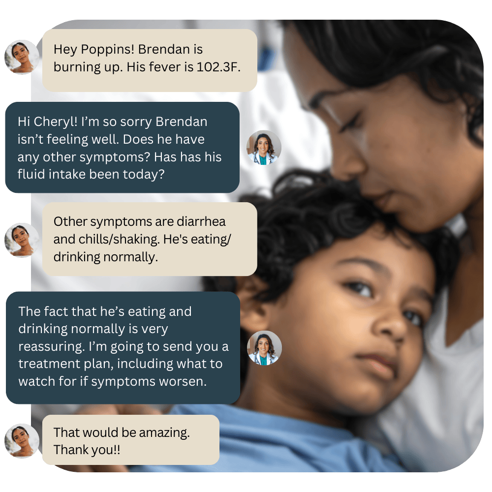 Virtual pediatric care is ideal for fevers, coughs, ear pain, rashes, vomiting, medication questions, and many common childhood illnesses — especially during evenings and weekends when pediatric offices are closed. Instead of paying for urgent care or an emergency room visit, many Pennsylvania families start with Poppins to determine whether home care is appropriate or in-person care is truly necessary.